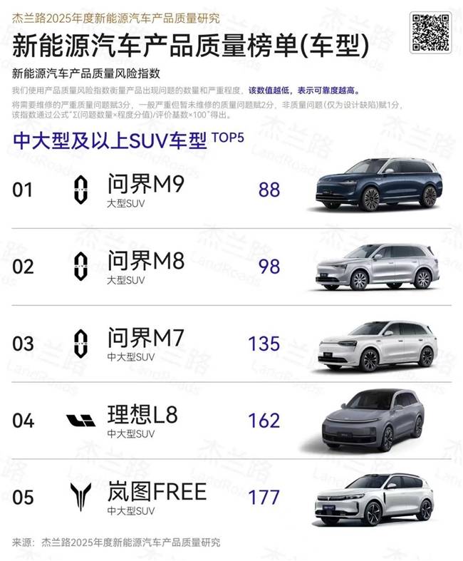 一系列行业权威报告,印证了问界M9的硬实力。根据杰兰路最新发布的《2025年度新能源汽车产品质量研究》显示,在中大型及以上SUV市场中,新能源汽车产品质量排名第一的车型为问界M9;《2025年度中国汽车保值率报告》显示,问界M9包揽插混车型(含增程)及纯电动SUV保值率双料第一;根据杰兰路2024上半年-2025下半年新能源汽车品牌健康度研究显示,问界M9更连续四期新能源全车型用户净推荐值第一,成为新能源SUV车型中第一个、唯一一个连续四次获得NPS第一的车型。产品质量、保值率、用户口碑形成的“飞轮效应”,让问界M9长期霸榜各大榜单,也为品牌构筑了一道扎实的护城河。