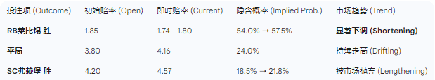 深度解读:初盘阶段,市场给予了莱比锡1.85左右的回报率,这在德甲主场对阵中游球队的语境下,是一个相对谨慎的看好信号。然而,随着弗赖堡主力中卫连哈特确诊腹部肌肉伤势并缺席大名单的消息在过去24小时内发酵 ,敏锐的“聪明钱”(Smart Money)开始大举介入主胜选项。特别是亚洲盘口,从最初的莱比锡让0.5/0.75球,迅速调整为坚定的让0.75球甚至部分机构升至让1球。这种盘口的剧烈变动,通常意味着庄家在通过降低主胜赔率来控制赔付风险,同时也反映了机构对于弗赖堡临时拼凑的后防线 进球数市场与交易心理